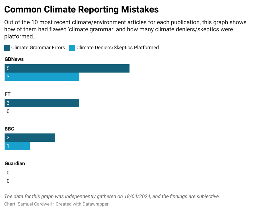 To investigate this issue, the 10 most recent climate articles from several publications were examined to search for the ‘incorrect’ usage of climate grammar.